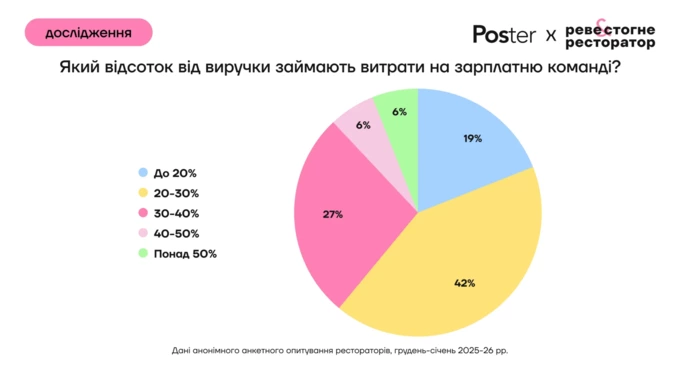 Витрати на зарплати найчастіше становлять 20–30% виручки (42% закладів). Ще 27% витрачають на команду 30–40% доходу.