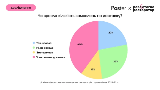 У 40% закладів доставки взагалі немає. Серед тих, хто з нею працює, у 37% кількість замовлень зросла, у 43% – не змінилася, у 20% – зменшилася.
