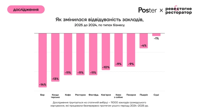 Відвідуваність падала майже в усіх сегментах. Найсильніше – у барах (-14%) і кондитерських (-13%). Найменше – у суші (-1%) та піцеріях (-4%).