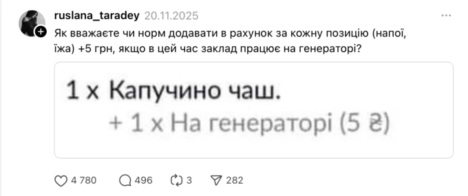 Користувачка Threads поділилася замовленням, до якого додали додаткову оплату за генератор. Скриншот Віледжа