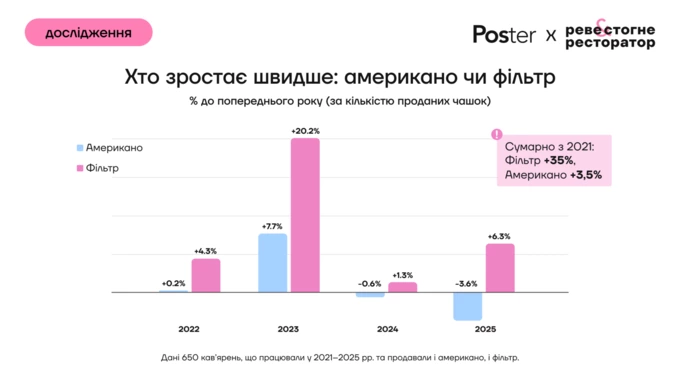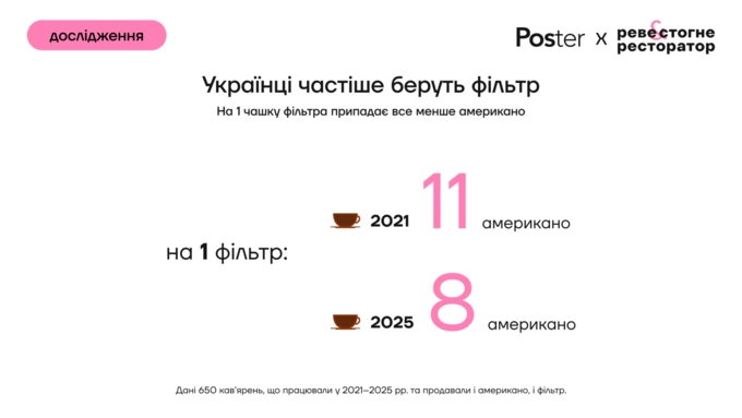 Аналіз компанії Poster ґрунтується на даних продажів 650 кав’ярень по всій Україні, які працювали з 2021 до 2025 рік і продавали як американо, так і фільтр-каву. У дослідженні порівнювали саме машинний фільтр, ручний не враховували.