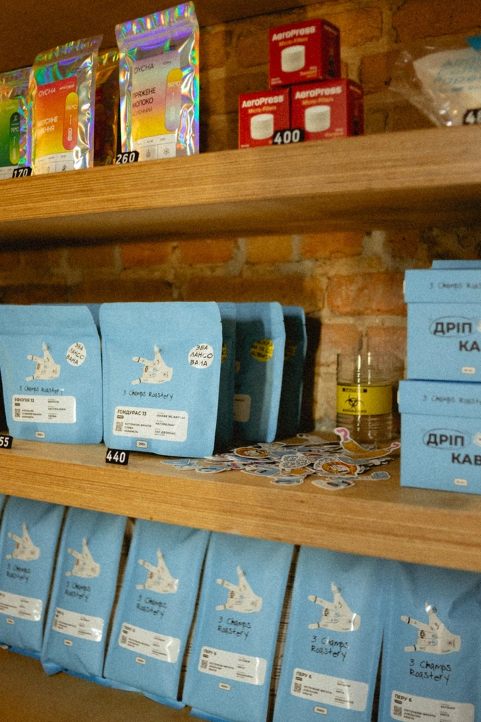 У меню – кава, десерти, сендвічі та сирники на сніданок. Також у закладі продають каву в зернах від 3 Champs Roastery та Mad Heads, дріпи й чай від Oycha, які можна купити додому.