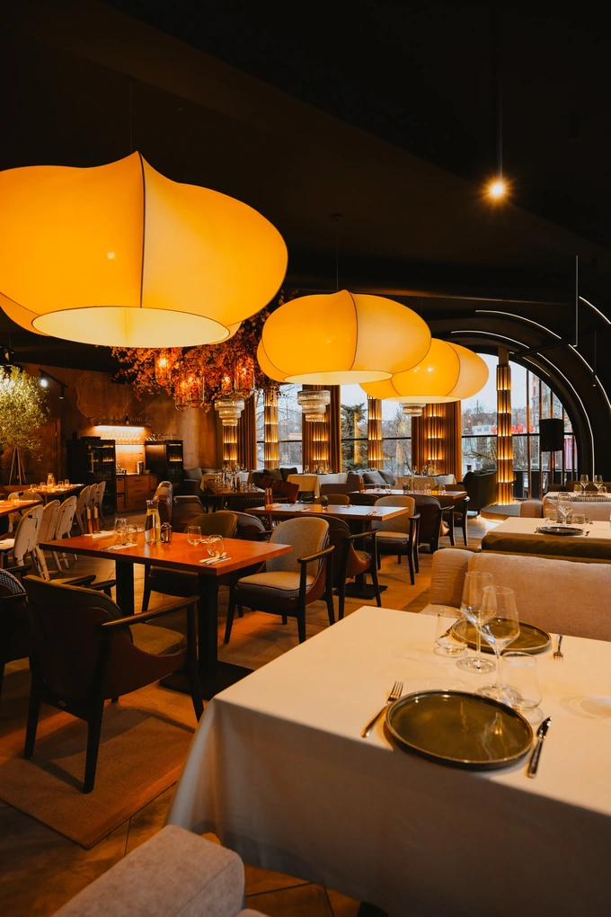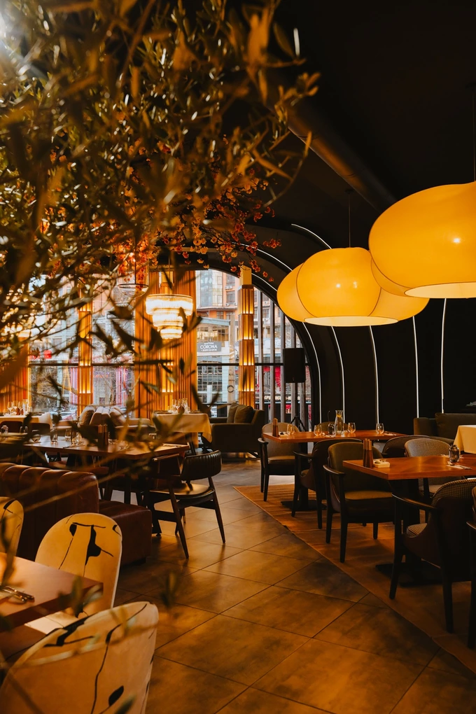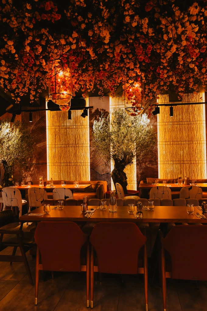 Локацію намагалися зробити такою, щоб люди робили багато фото, кажуть у закладі. Студія архітектури та дизайну Buro Studio створила інтерʼєр, там є велика квіткова інсталяція на стелі, дизайнерські люстри та оливкові дерева. До закладу можна завітати з домашніми улюбленцями.