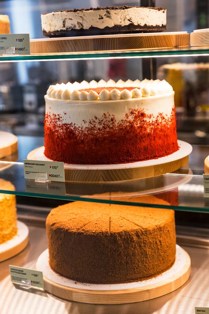 У кондитерській готують три десятки видів тортів за класичним та авторським рецептами. Є як класичний медівник і «Наполеон», так і авторські торт-рулет «Фісташка-апельсин» та японський шифоновий торт. Серед десертів – печиво, мафіни, тістечка шу, гранола, вафельні трубочки. Також є чотири види кішів із солоною начинкою й три види сендвічів із чіабати.