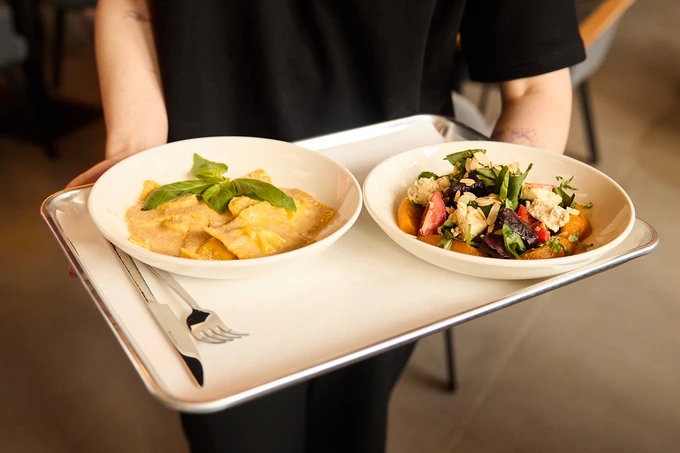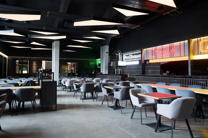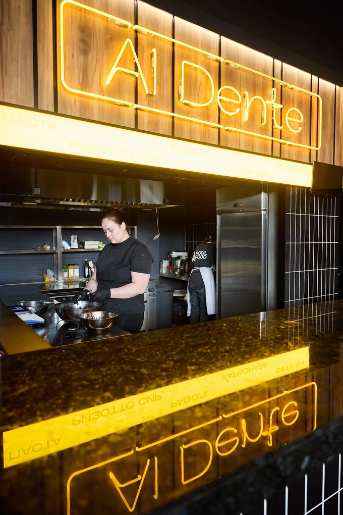 Podil Food позиціює себе не як класичний фудкорт, а як Food Hall із сервісом. Тут відмовляються від моделі «підійшов-забрав» і є повноцінне обслуговування. Гість може обрати зручний формат: замовити через офіціанта, скористатися QR-кодом або підійти до корнера, щоб подивитися, як крутять його пасту.