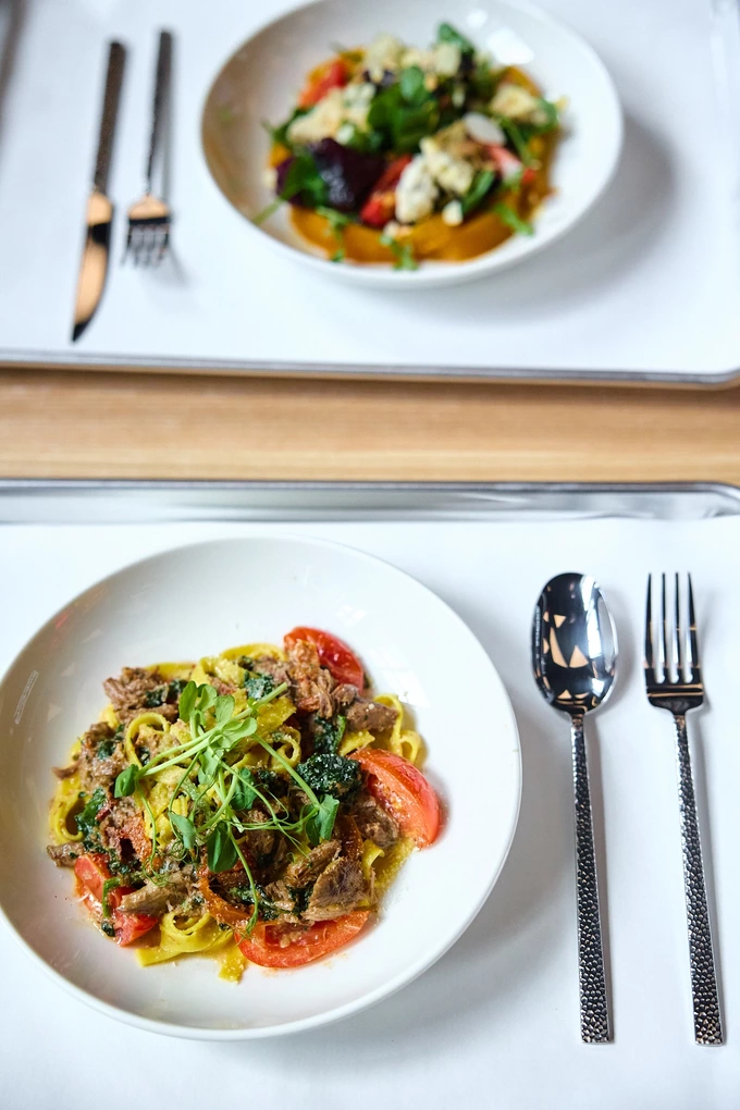 М’ясний корнер працює лише з українською яловичиною – тут готують як стандартні позиції, так і фірмовий гігантський бургер вагою понад 500 грамів. Також пропонують свіжу пасту, яку катають вручну з італійського борошна, а також домашні вареники та пельмені. Від піци відмовилися свідомо, щоб не заходити в і без того перегріту нішу, де в умовах фудхолу складно виділитися.