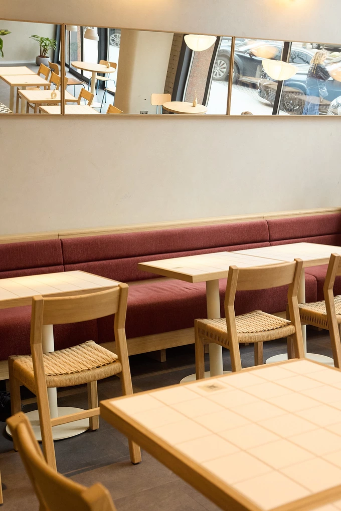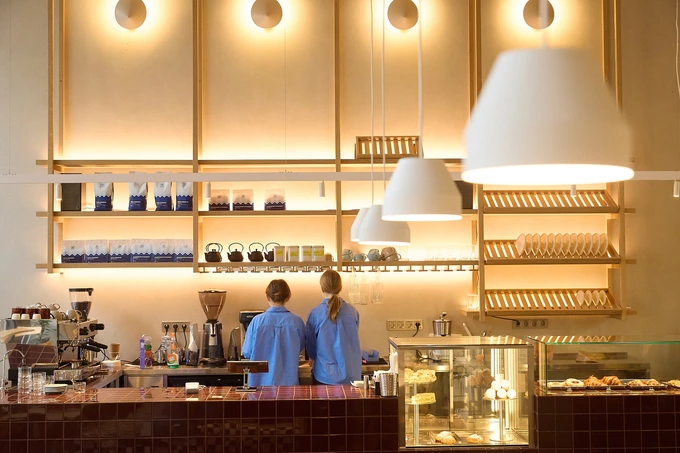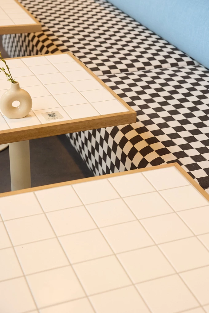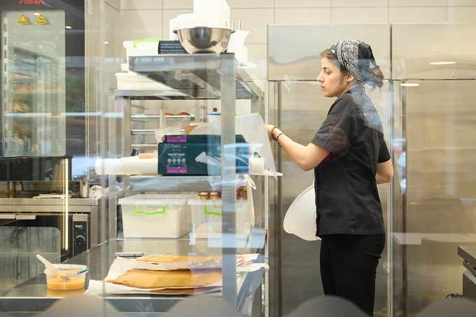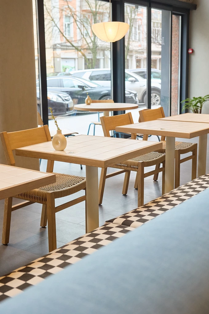 Центральним елементом простору є кондитерський цех за склом. Це рішення дало змогу не лише забезпечити свіжими десертами «Деінде», а й централізувати виробництво для «Вітра», де потужностей кухні бракувало.