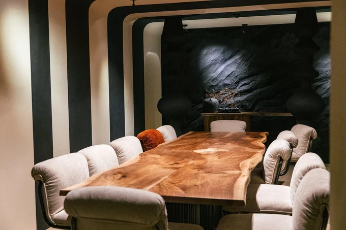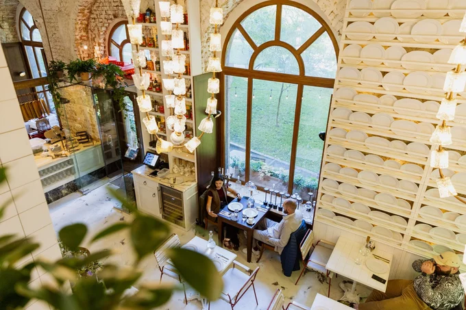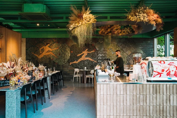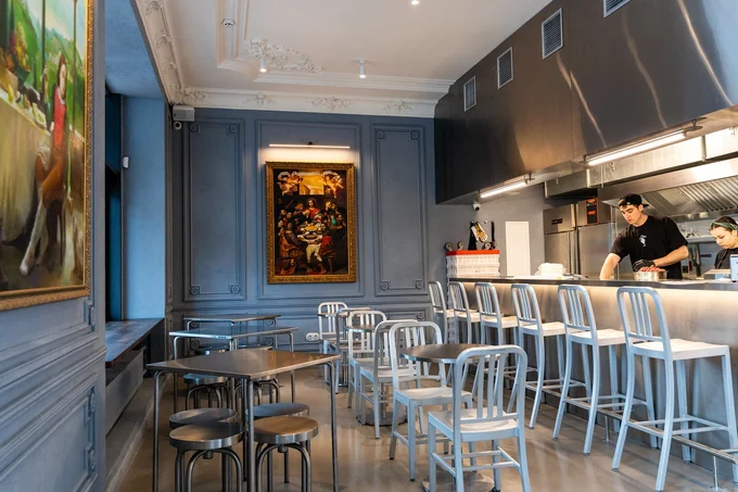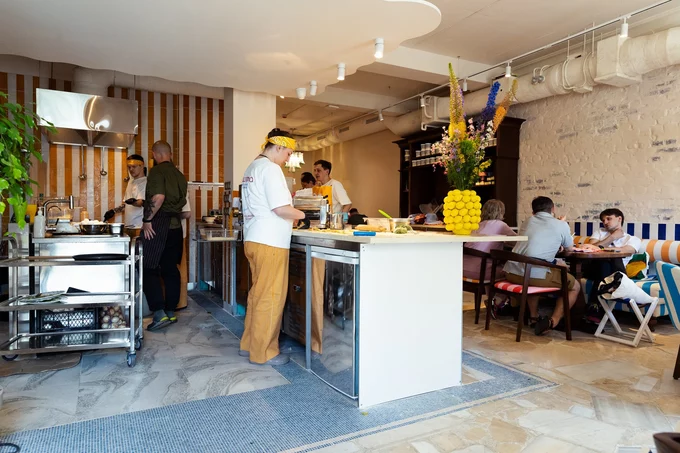 Сам заклад умовно поділили на дві частини: відкрита кухня поєднується із залою, де є великий стіл і стільниці. Над проєктом працювало українське архітектурне бюро AKZ Architectura.