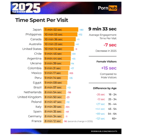 Середня тривалість відвідування PornHub у 2025 році серед українців збільшилася на 14 секунд і становила 9 хвилин і 41 секунду.