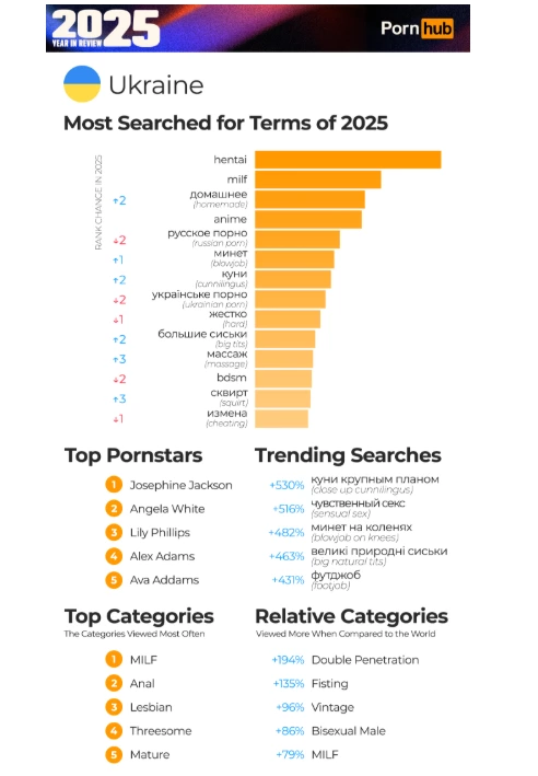 Трійку найпопулярніших порнозірок PornHub в Україні склали Джозефіна Джексон, Анджела Вайт і Лілі Філліпс. Глобальний рейтинг очолюють Алекс Адамс, Анджела Вайт і Вайолет Майєрс.