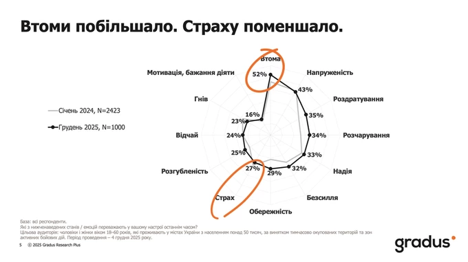 Найбільше люди відчувають утому – на цей стан скаржаться 52% опитаних українців. 43% опитаних кажуть, що відчувають напруженість, ще 35% – роздратування і 34% – розчарування. Водночас 33% все ще відчувають надію, додають у Gradus Research.