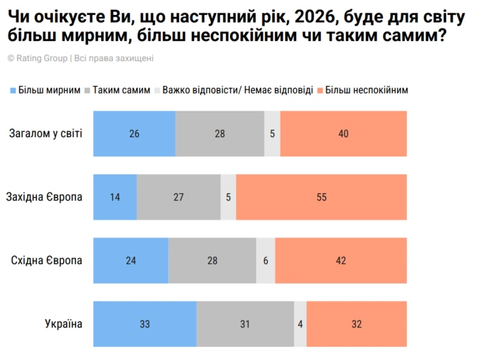 В усьому світі 40% опитаних думають, що рік буде більш неспокійним, а 26%, – що більш мирним. У західній Європі ці показники складають – 55% та 14% відповідно, а у східній Європі – 42% та 24%.