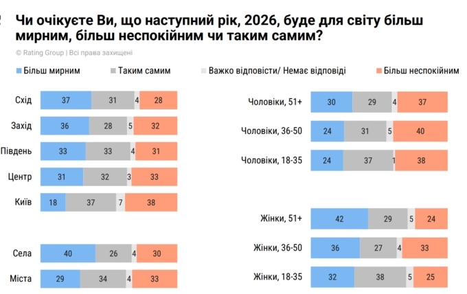 У Києві такої думки дотримуються 38% жителів і лише 18% думають, що 2026 рік більш мирним. При цьому у східній частині 28% опитаних сподіваються, що 2026 рік буде неспокійним, а 37% очікують на більш мирний рік.