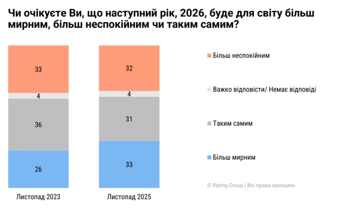 Щодо очікувань миру, то 32% українців думають, що 2026 рік буде більш неспокійним за 2025, а 33% припускають, що він буде більш мирним.