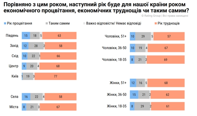 Ще 11% українців сподіваються, що 2026 стане роком процвітання. Якщо говорити про регіони, то найбільше опитаних, які думають, що наступний рік буде економічно важчим, ніж 2025 у Києві – 77% та у центральній частині України – 68%. У розрізі віку та статті найбільше такої думки дотримуються чоловіки віком 18-35 років – 69%.