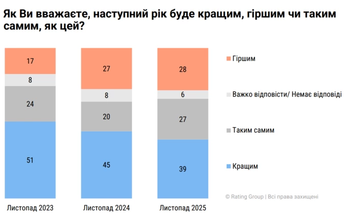 Загалом 28% українців вважають, що 2026 рік буде гіршим за 2025, а 39% вважають, що кращим.