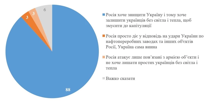 Абсолютна більшість українців – 88% – вважають, що цими ударами Росія намагається залишити українців без світла й тепла та примусити до капітуляції. Водночас вважають, що Росія завдає лише удари у відповідь і винна сама Україна – 3%. Стільки ж (3%) вважають, що Росія атакує лише військові об’єкти.