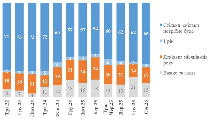 Водночас більшість українців (65%) продовжують відповідати, що вони готові терпіти війну стільки, скільки потрібно. Про більш короткий період (пів року чи декілька місяців) говорять 17% респондентів.