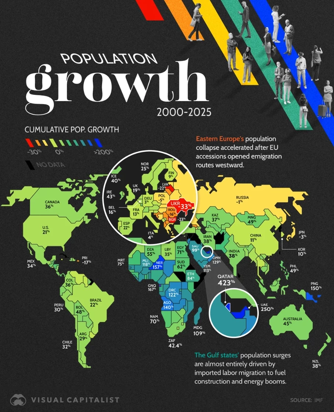 У країнах із системною та привабливою імміграційною політикою фіксують стабільний розвиток: населення Канади збільшилося на 35,6%, Австралії — на 44,9%. Серед економічних гігантів найкращий показник показала Індія, населення якої збільшилося на 38,4%. У США приріст на 21%, у Бразилії – 22,1%.