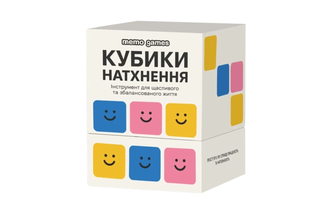 Настільна гра «Кубики натхнення» – це творча психологічна гра для 1–8 гравців, що триває від 2 до 45 хвилин. Гравець обирає один із дев’яти тематичних кубиків, кидає його та виконує завдання з колоди з 54 можливих дій, наприклад, створити новий плейлист, пообідати на природі, подзвонити близькій людині, виконати дихальні вправи.