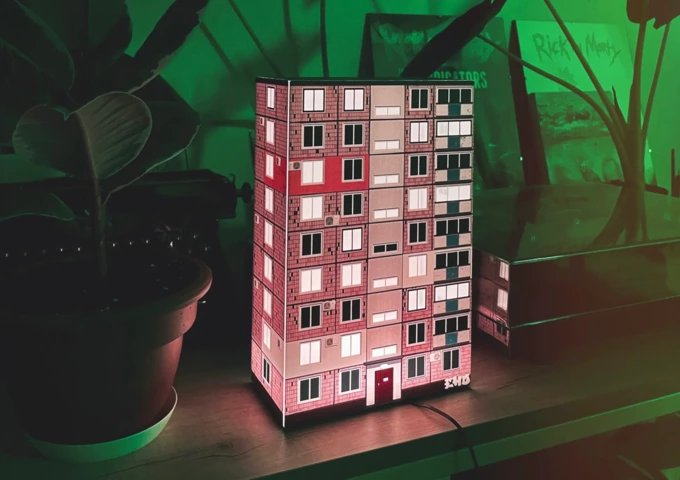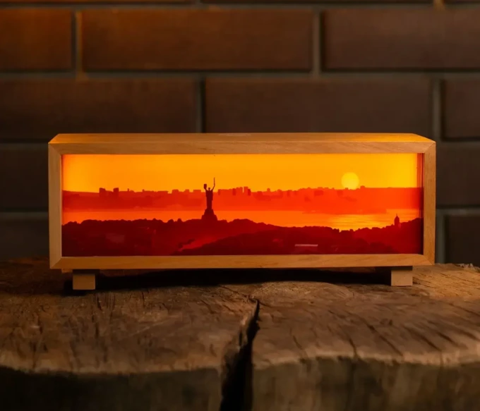 Нічник із панорамою Києва виготовляють вручну з корпусом із натуральної вільхи й художнім зображенням на трьох шарах акрилу з ультрафіолетовим друком. Така конструкція забезпечує паралакс-ефект і глибину картинки, що підсвічена теплим LED-світлом, каже виробник. Модель має сенсорну кнопку, акумулятор для автономної роботи протягом 12 годин, змінні панелі та зарядку.