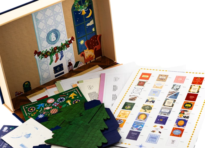 Календар складається з 31 книги, серед яких українські та закордонні казки. Розмір кожної книжки – 40 x 45 мм.