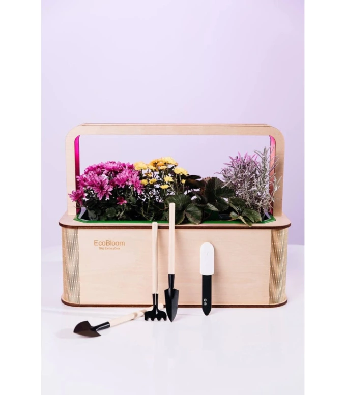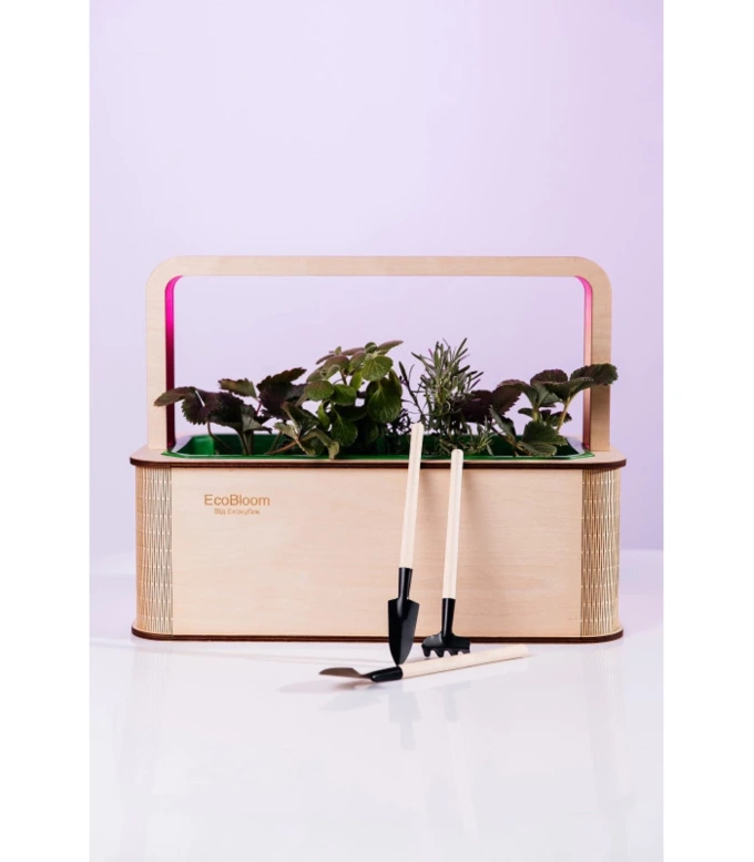 Набір включає багаторазовий дерев'яний «кошик», спеціальну фітолампу, датчик вологості, лоток для ґрунту, сам ґрунт і насіння, а також лопатки й граблі. Пропонують варіанти для вирощування овочів, квітів, мікрогріну, трави й чайних рослин.