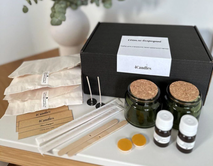 У комплекті є баночки (їхній вигляд може відрізнятися від фото), віск, гноти, а також ароматичні олії, які можна обрати або замовити індивідуально. До набору додається докладна інструкція для старту у створенні свічок власноруч. Також можна додатково замовити листівку й сірники.