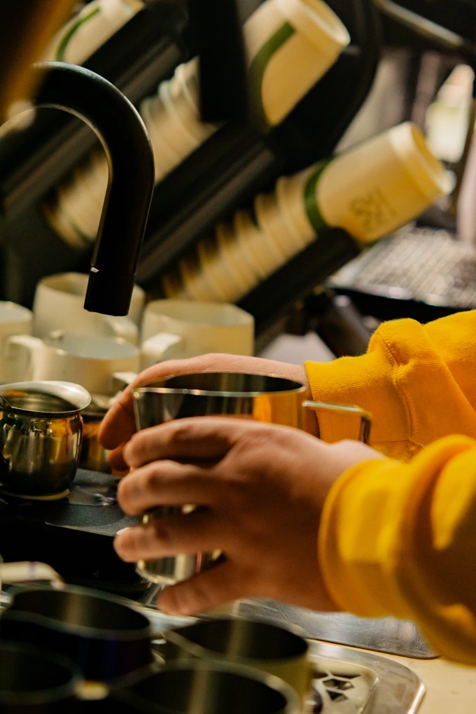 Спершу ми взагалі тренувалися на мильній воді – щоб не псувати багато молока. Брали воду, додавали мило й виходила пінка, яку треба було збивати. У мильної води й молока різні консистенції, збивати мило важче, але якщо все вийде з ним, то й із молоком теж. Каву ми не готували – просто витреновували збиття: береш пітчер [металевий глечик, де збивають молоко], додаєш воду й мило, збиваєш і виливаєш – так по колу, поки не вийде.