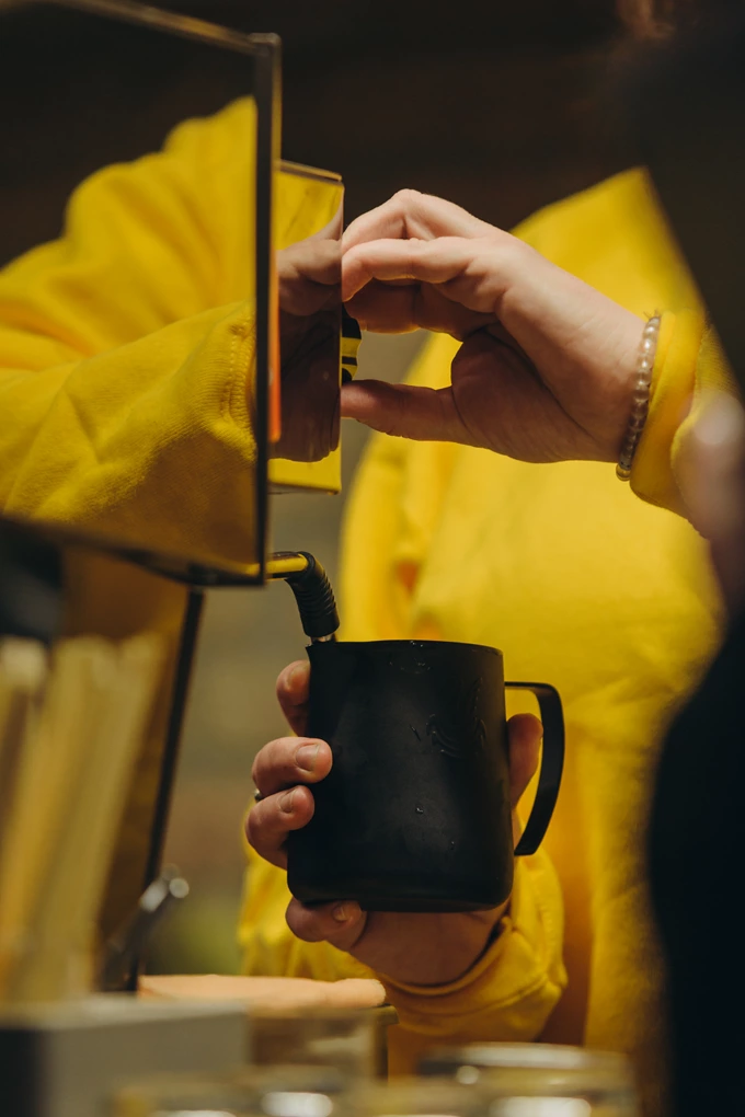 Трошки пізніше до нас прийшов Данило – бариста, який працює в кав’ярні Campus на «Поштовій площі» – і розклав усе по поличках. Саме з ним я перестала боятися збивати молоко: раніше постійно совала пітчер туди-сюди [так робити не можна], а тепер знаю, як звучить молоко.