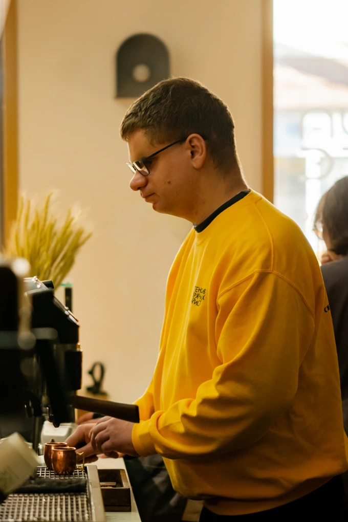 Після 100 чашок капучино в музеї гіди пішли на стажування в київські кав’ярні – шістьох уже барист розподілили по шістьох різних точках у Києві. Ми поспілкувалися з незрячими Ярославом і Вікторією, які готують капучино, какао або еспресо.