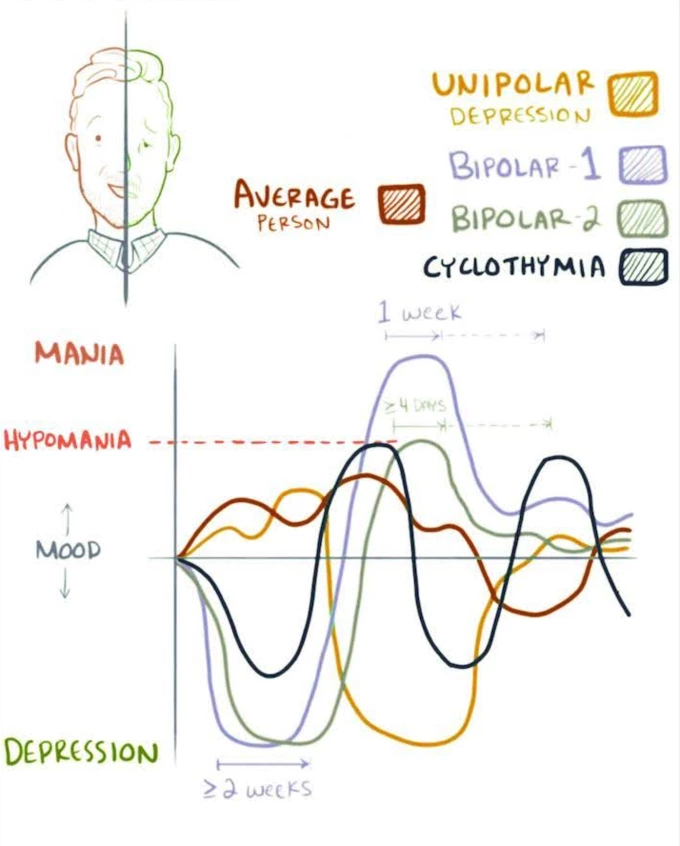 Циклотимія – розлад біполярного спектра. Від біполярних розладів цей діагноз відрізняє те, що періоди манії й депресії менш виражені й називаються гіпоманія та субдепресія, але вони також регулярні й виснажливі. Якщо вчасно не виявити цей діагноз і не почати приймати ліки, циклотимія може перерости у важчі форми біполярного афективного розладу.