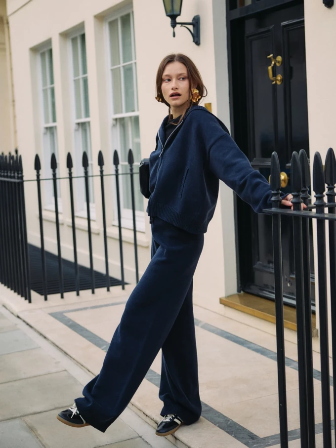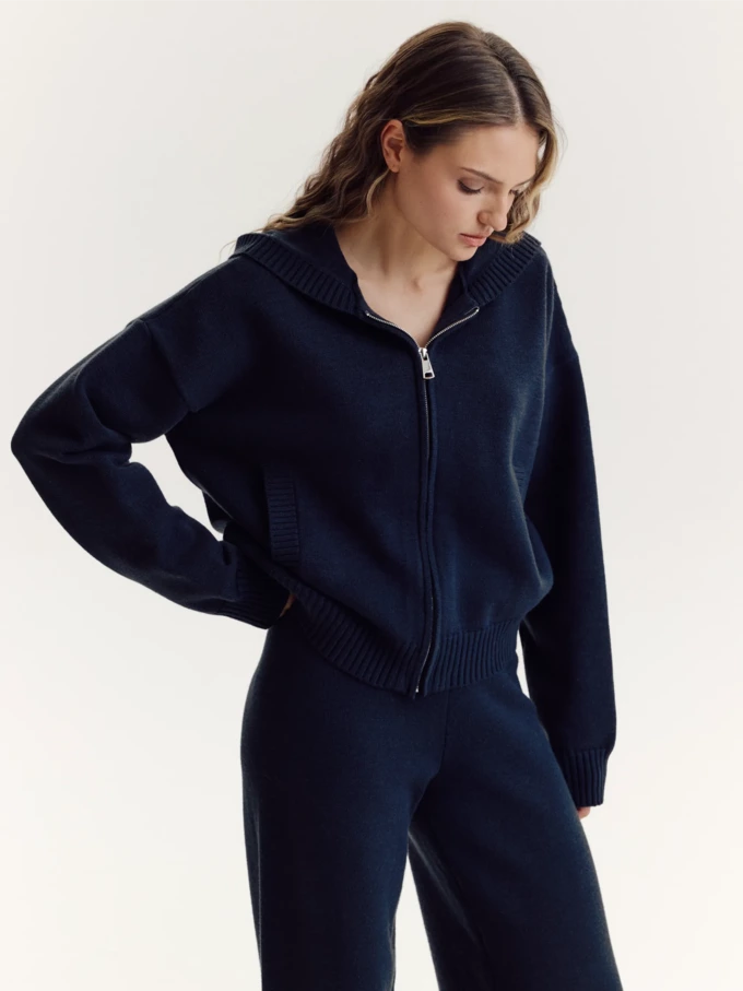 Без трикотажного костюма важко уявити цю добірку. Вибір зупинився на темно-синій костюм 044 Garden прямого крою, що не потребує додаткової стилізації. Це готовий лук на щодень – саме на той випадок, коли «щось випало із шафи», але виглядає зібрано й стильно.