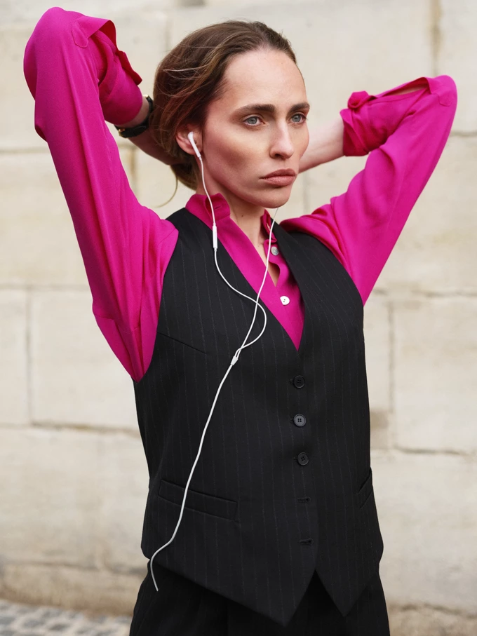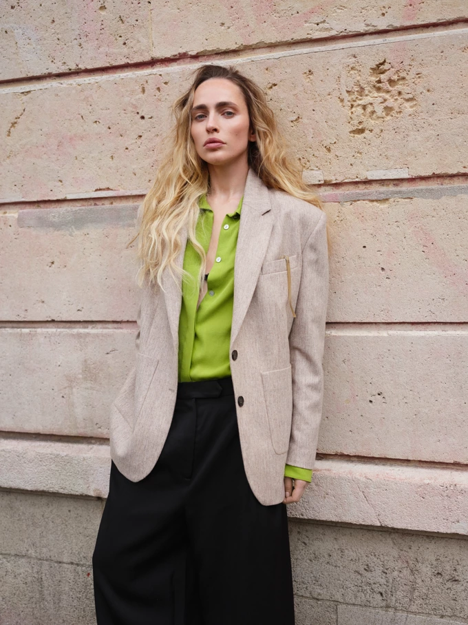 У колекції поєднали піджаки з легкими та яскравими сорочками, м’якими жилетами й більш розслабленими силуетами. Палітра кольорів дропу – відтінки бежевого, сірого, синього та чорного, а акценти – насичено зелений, фуксія і яскраво червоний.