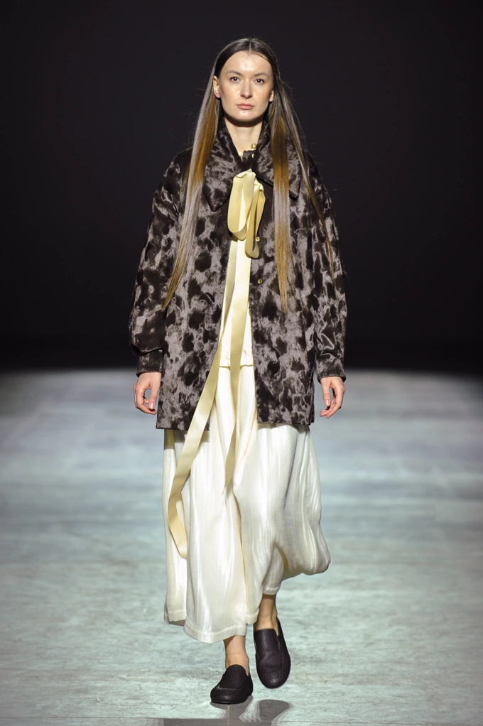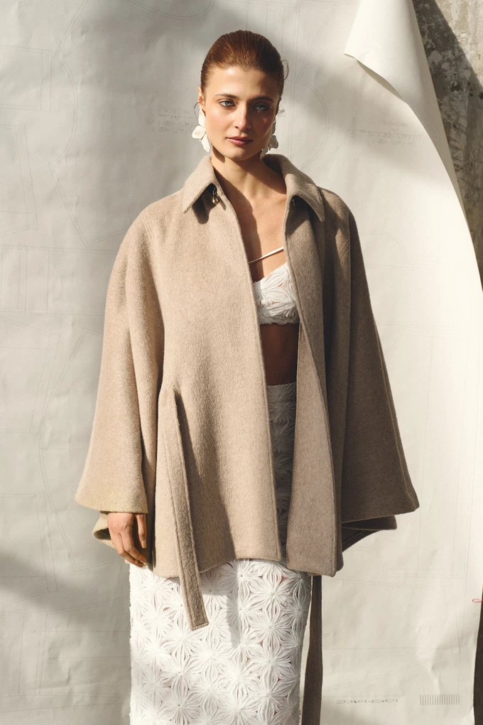 Ключові матеріали колекції – текстуровані тканини з рельєфною поверхнею, а палітра побудована на природних відтінках: молочному, пісочному, сірому та чорному.