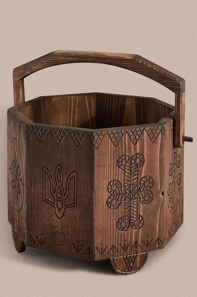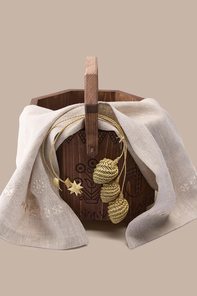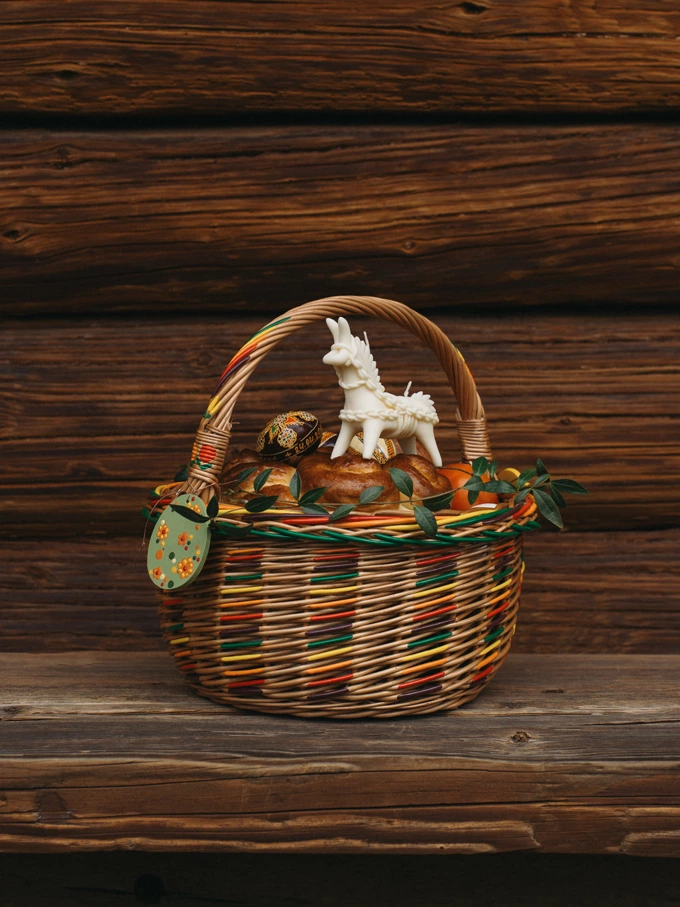 Автентичні елементи Великодня можна знайти в рушнику, вишитому матовими й блискучими нитками чи соломʼяних іграшках у формі писанок для прикраси кошика. Сам кошик створений за мотивами пасківника – традиційної гуцульської обрядової посудини – і має різьблення у вигляді тризуба. Кошики й іграшки майстри Lady Di Atelier створюють вручну. На виготовлення одного пасківника витрачають приблизно 16 годин роботи.