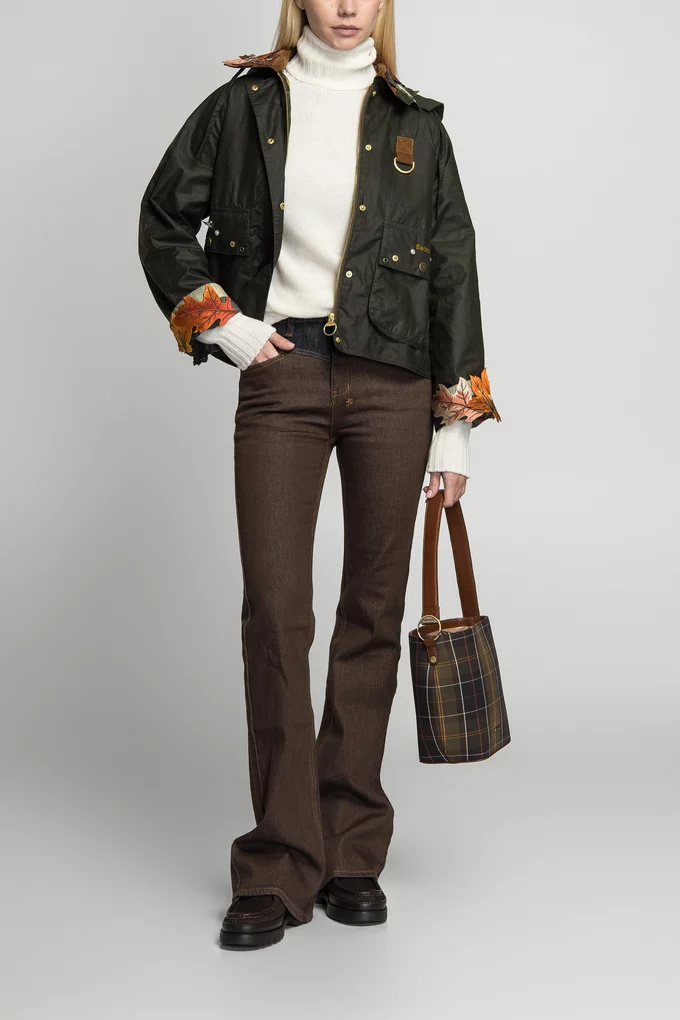 Перша – класичний силует Barbour, який доповнили вставками з деніму. Підкладку виробу з принтом «тартан» зберегли як частину оригінального виробу. Куртку доповнили кастомними бирками, фурнітурою й металевими елементами.