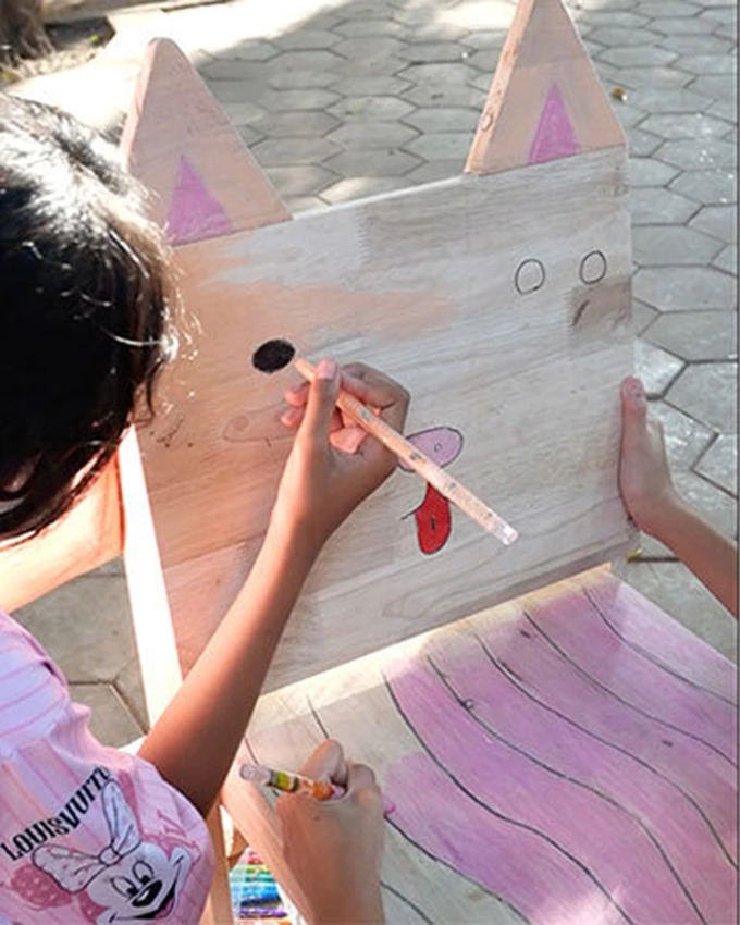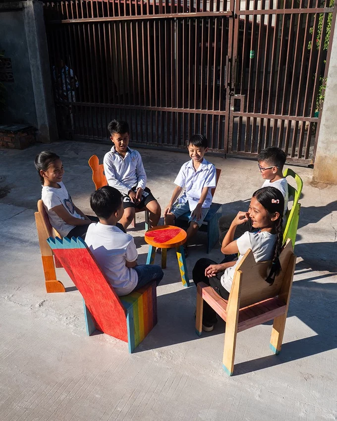 Це проєкт "Chair for Kids", який дизайнер Техан Юн створив разом з учнями англійської школи в Сіємреапі. Понад 70 дітей намалювали свої стільці, враховуючи власний зріст та розміри тіла, щоб сидіння було зручним саме для них.