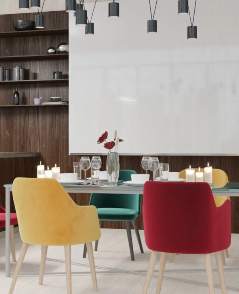 Якщо ви надаєте перевагу нейтральним відтінкам в інтер’єрі, але хочете «освіжити» свою оселю, додайте яскравих акцентів за допомогою меблів і декору. Для цього підійдуть подушки та кольорові стільці. Наприклад, крісло-стілець «Марті» має незвичний і водночас ергономічний дизайн. «Венето» пропонують його в яскравих кольорах залежно від обраної вами кольорової гами. Такий контрастний акцент доречно виглядатиме як у класичних, так і в хай-тек інтер’єрах.